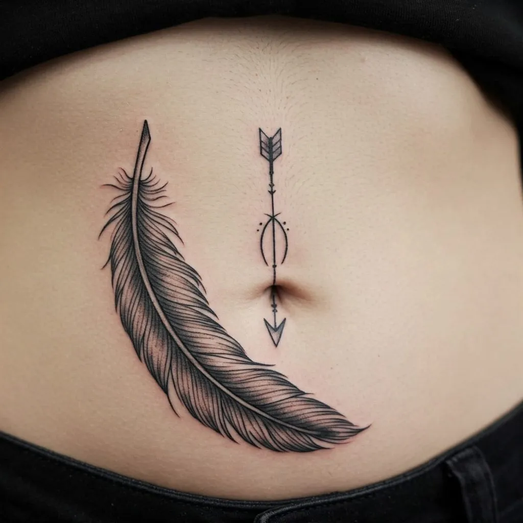 Incorporate a feather with an arrow pointing toward or just above the belly button. The arrow can represent direction, movement, or purpose, while the feather symbolizes lightness, freedom, and spiritual growth.