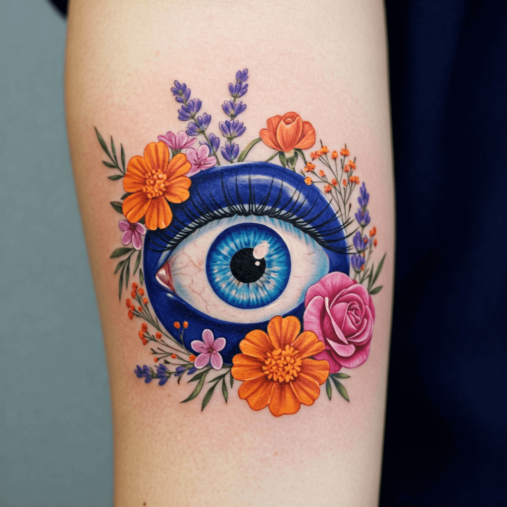 Encircle the eye with delicate flowers like lavender, roses, or marigolds. Start by sketching a realistic eye with blue and white tones, then weave botanical elements around it. This design gives a feminine and nature-connected vibe while keeping the protective symbolism.