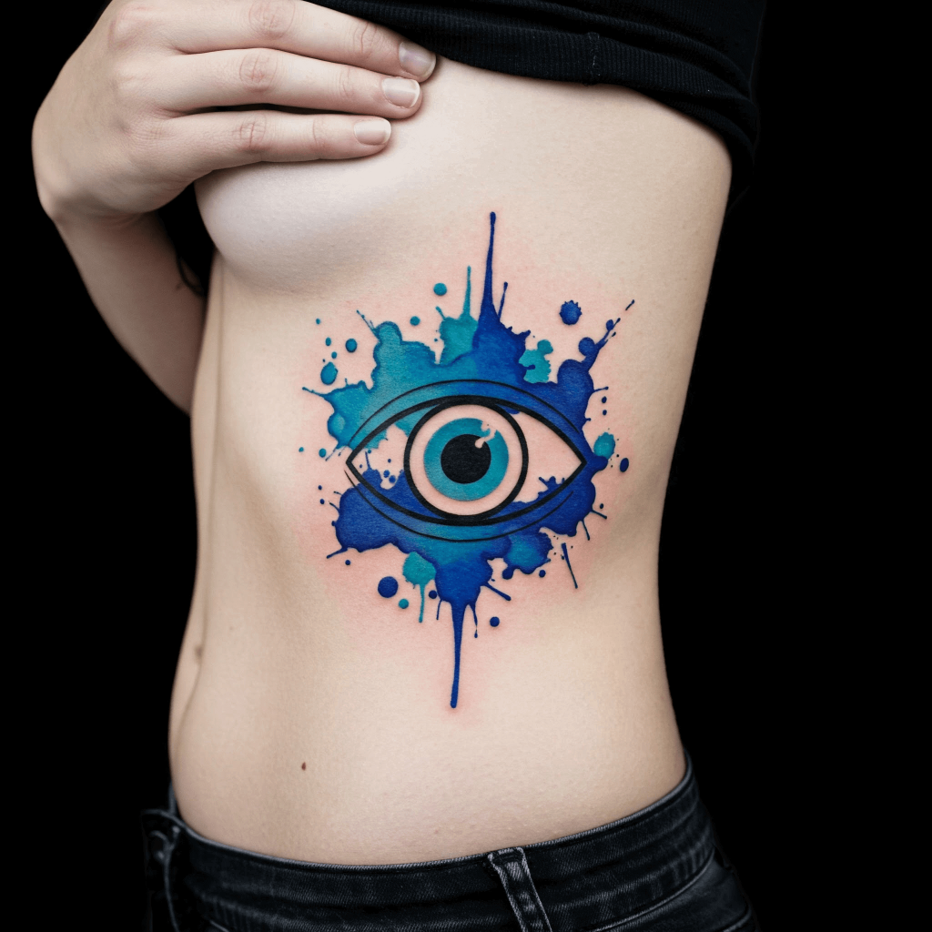 Use splashes of blue, indigo, and teal watercolor around a simple evil eye. Begin with a clean outline of the eye, then add irregular color bursts around it using a watercolor effect. This creates a dreamy, modern version of the protective charm.